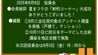 町内会から 町内会の役員会を開催 8月8日(金)、麻生地区会館で町内会の役員会を開催しました。役員会では、はじめに、会長から夏まつりが無事故・大成功で終わったことへの謝辞がありました。そのあと協議に入り、①町内会の区域にお住いのすべての方を対象にした「住民アンケート」の実... 町内会から